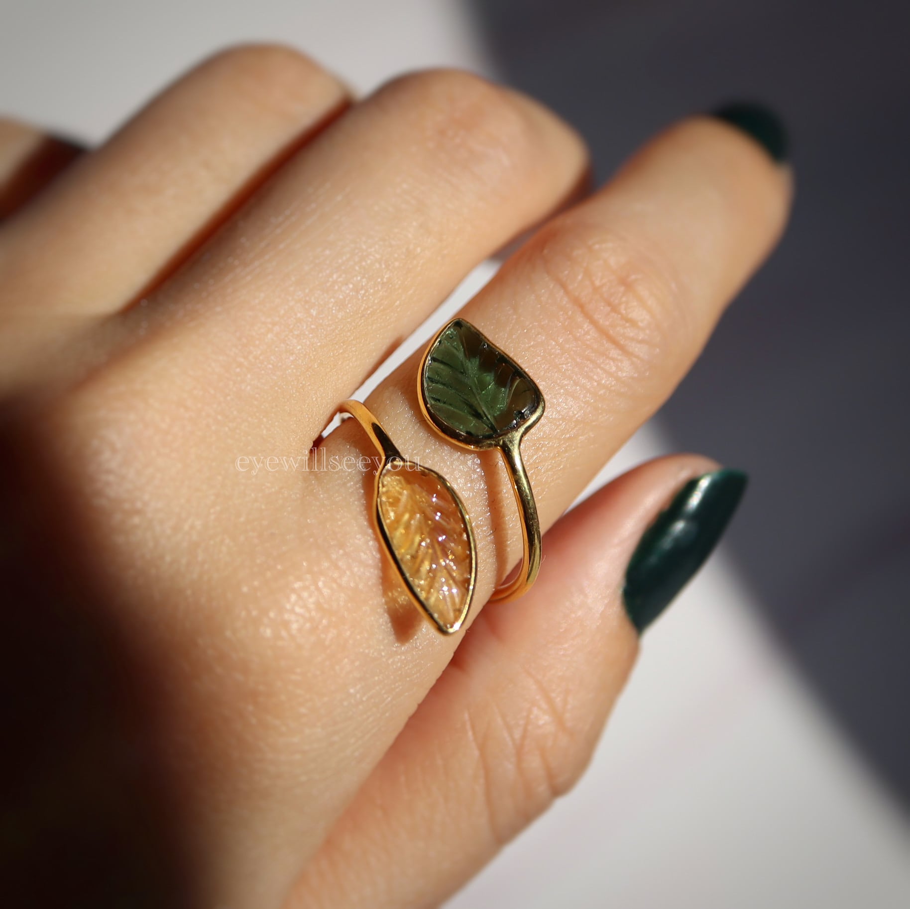 (調整可 12号)Tourmaline leaves open ring トルマリンリーフカービングリング