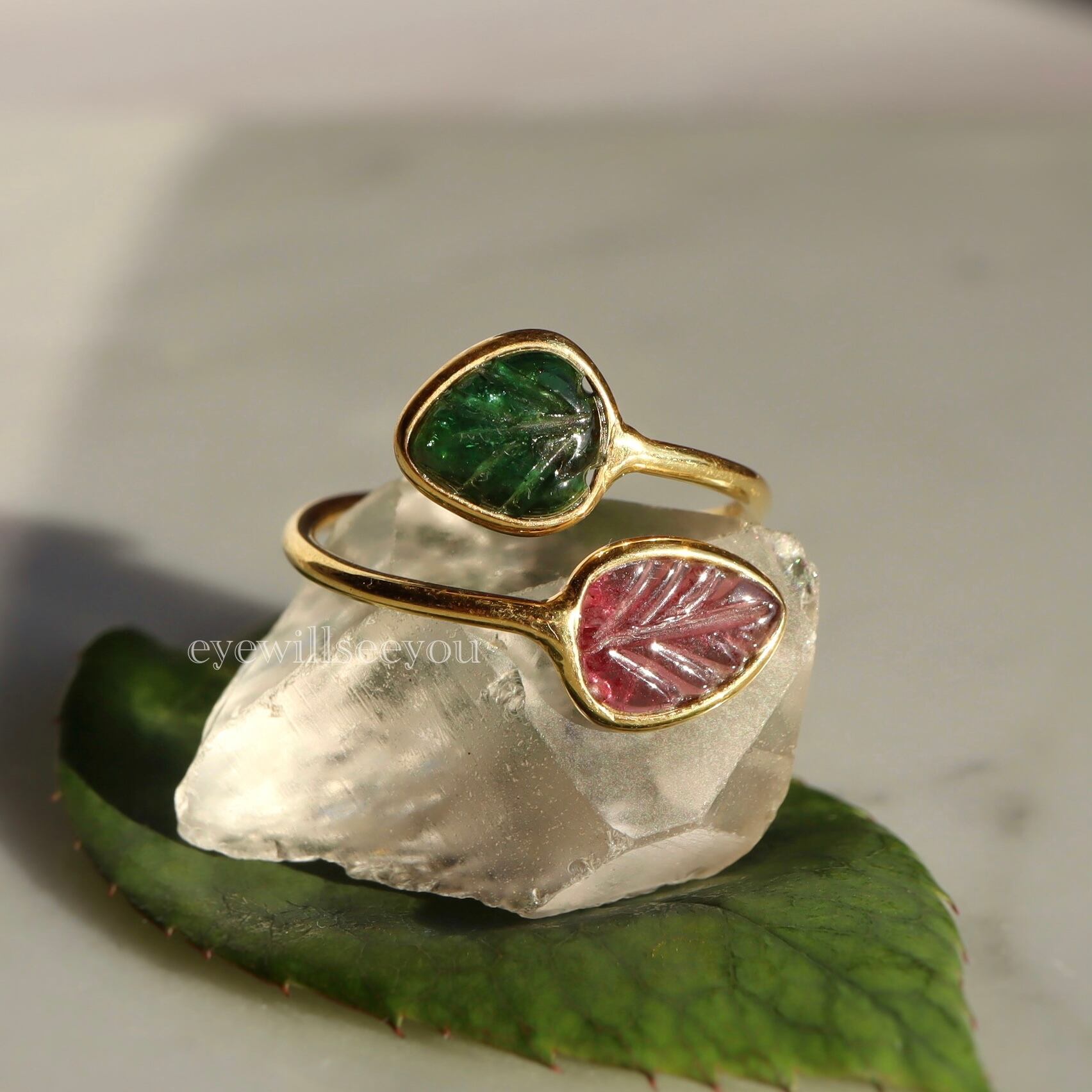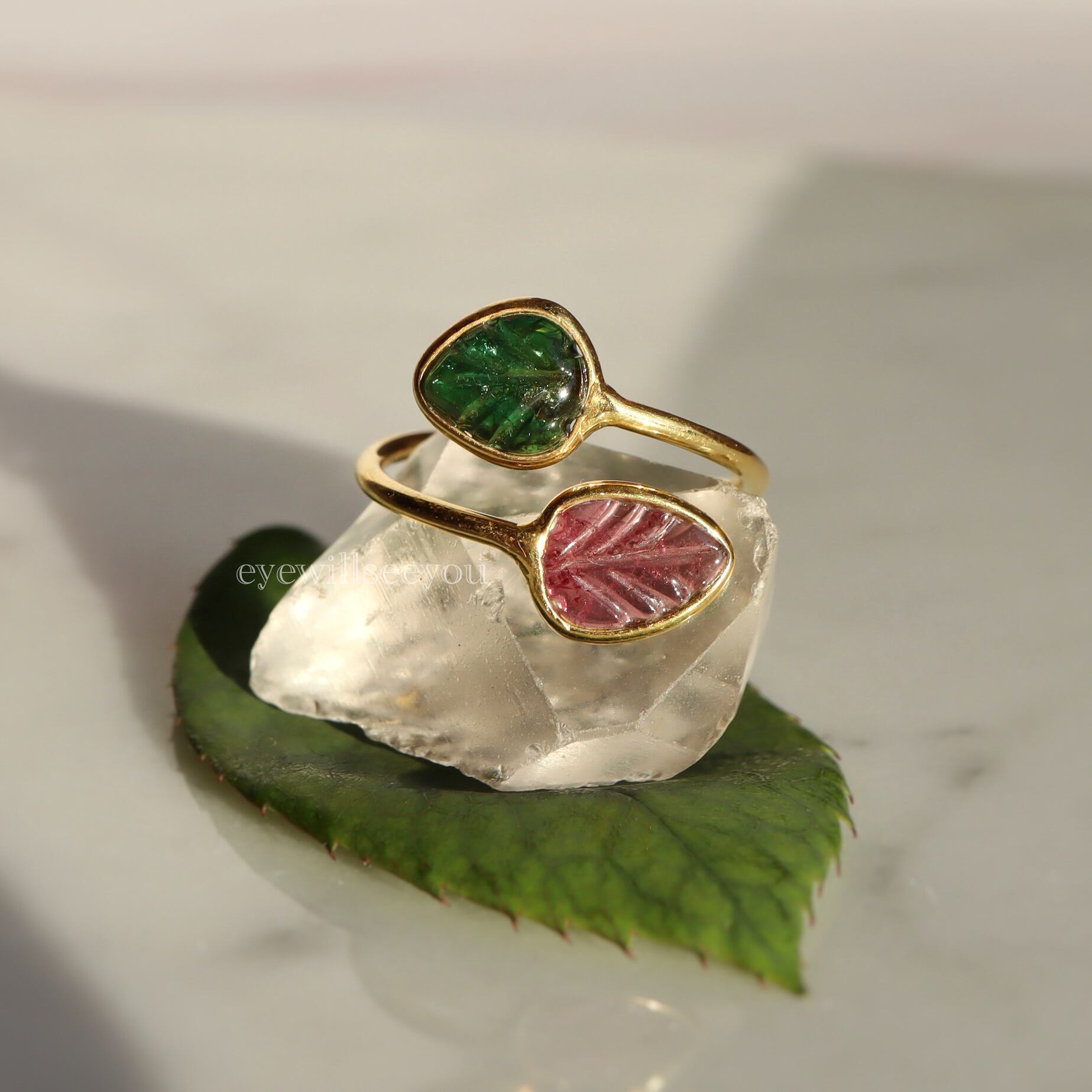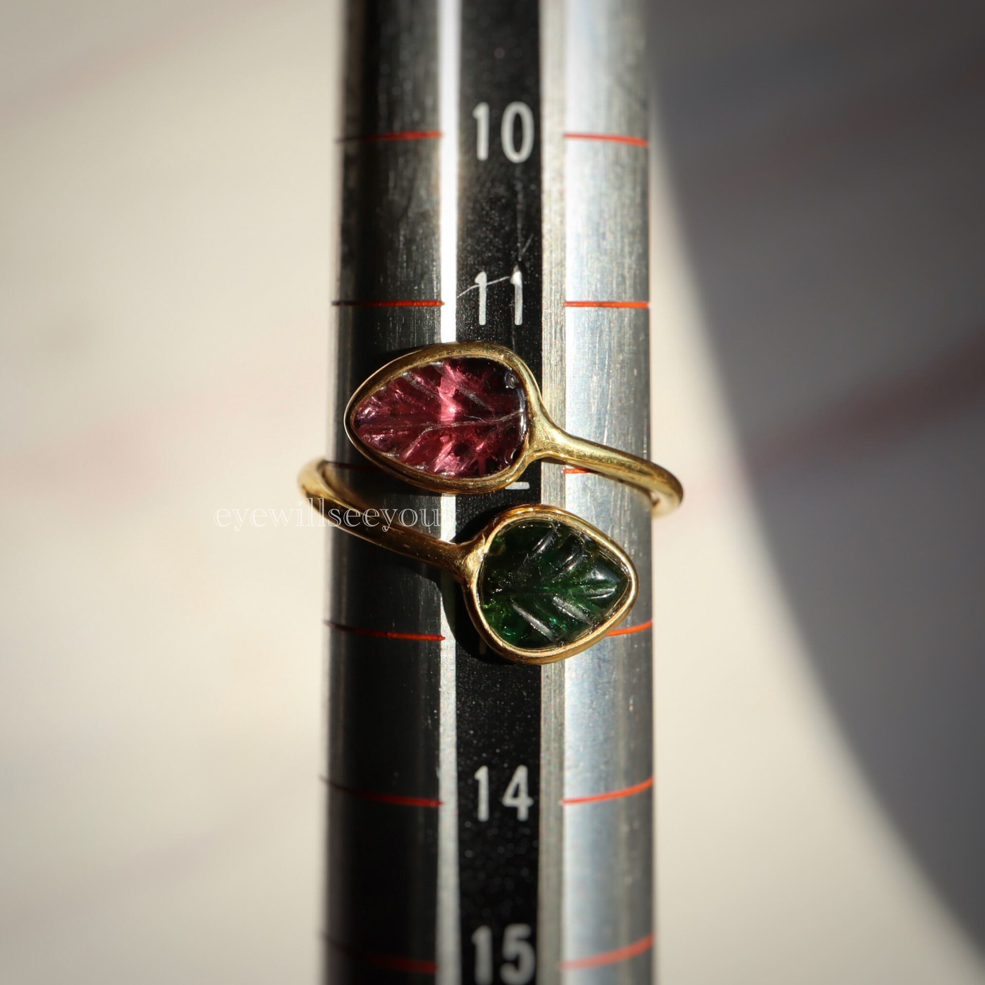 (調整可 約11.5号)Tourmaline leaves open ring トルマリンリーフカービングリング
