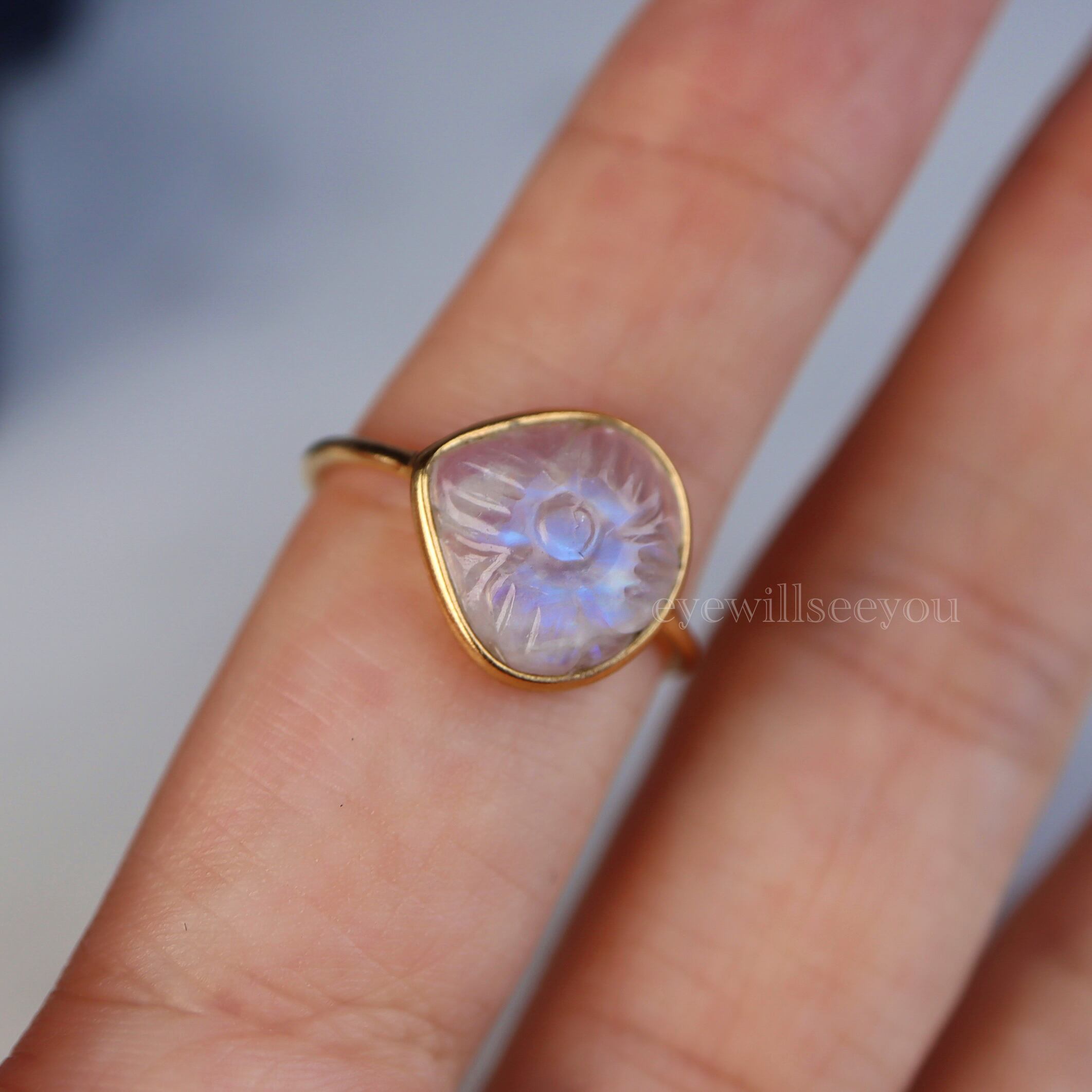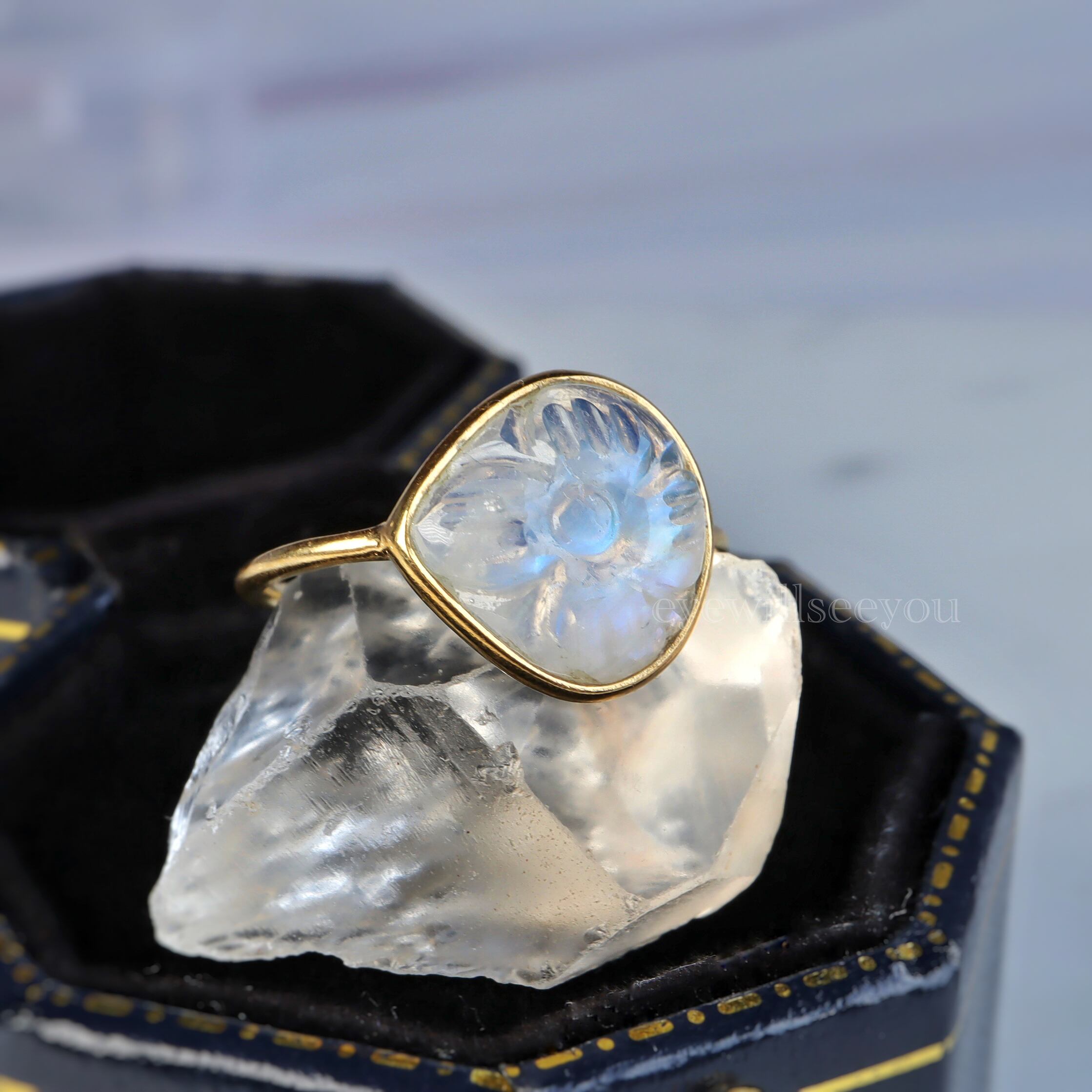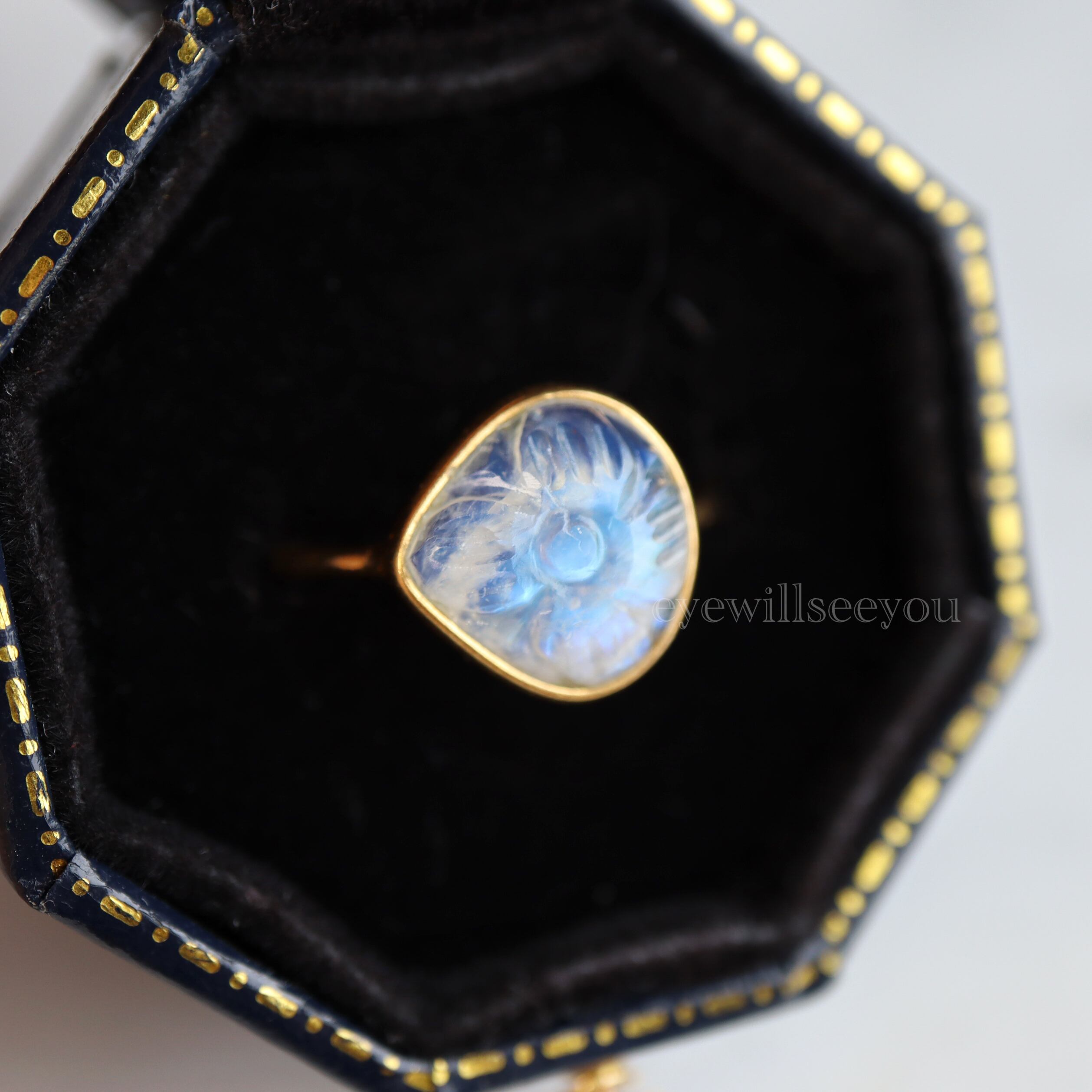 世界的な宝石の都、インドのジャイプールの工房で製作した、月明かりのように神秘的なシラーが浮かび上がるレインボームーンストーンのカービングリングです。